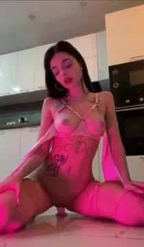 Ragazza mora tatuata gode in cucina